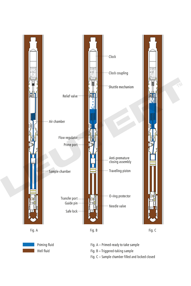 Since laboratory analyzes are only as good as the samples taken, truly representative samples of formation fluid under reservoir conditions must be taken. The Leutert Positive Displacement Downhole Sampler PDS delivers truly representative samples in unaltered condition. No separator is required at the well. The downhole fluid sampler is lowered into the wellbore on a slickline so that a sample of the fluid can be taken under the elevated pressure of the fluid column. Leutert downhole samplers can be operated in banks with up to eight tools. Each downhole sampler has its own clock, giving flexibility in deciding when and at what depth shall be sampled. Alternatively, Leutert downhole samplers can be operated with wireline or electric line, coiled tubing or sucker pump rods. A drillstem sampler is also available. Downhole fluid samples can be transferred to the sample cylinder on site without the use of mercury.